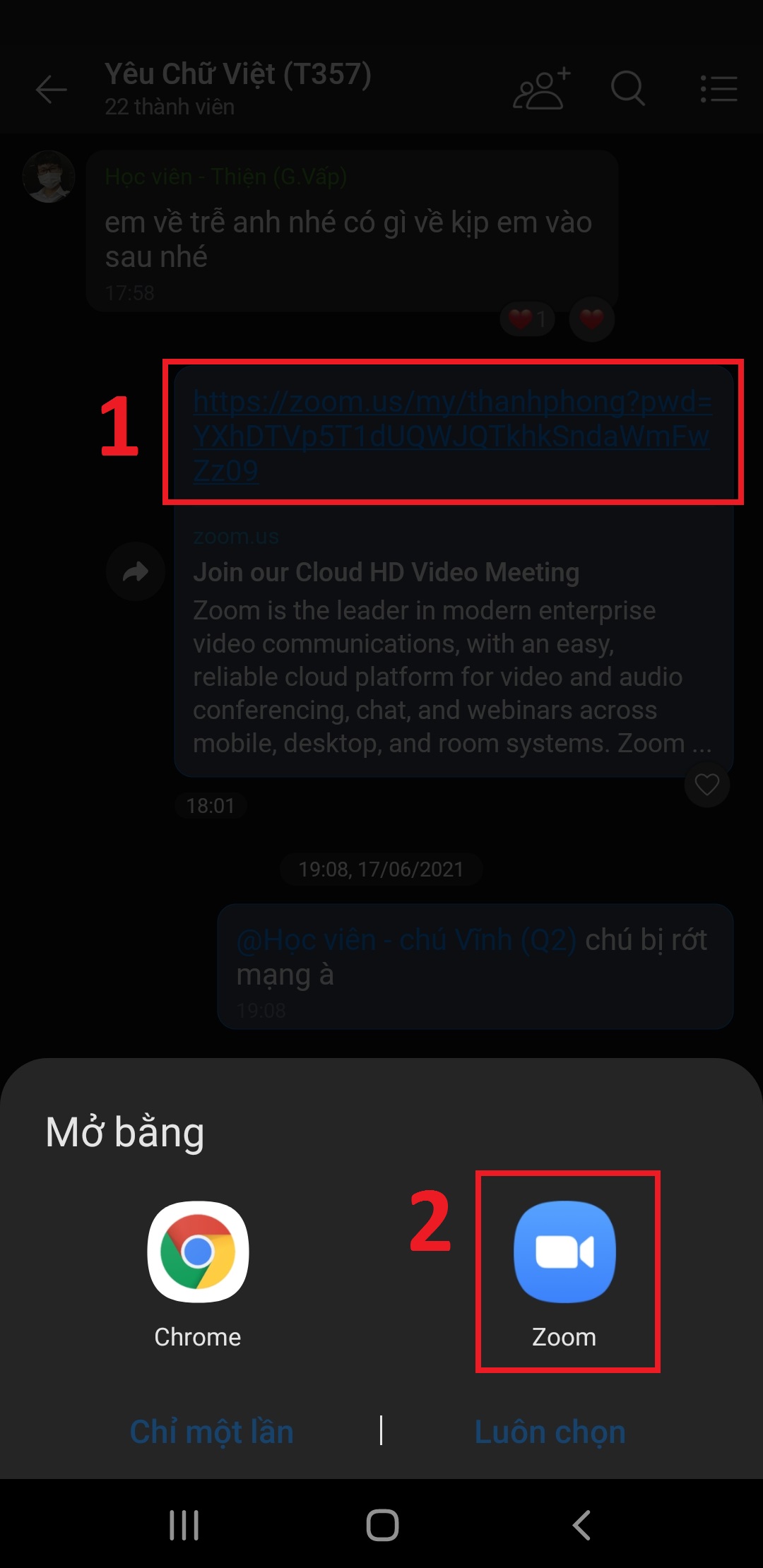 - Học viên nhấn vào đường link Zoom được gửi tại Nhóm Zalo.
