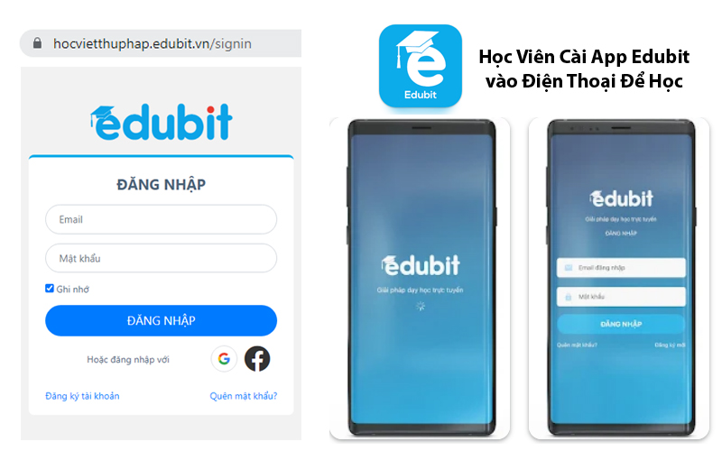 Học viên sẽ được cấp Tài khoản để học qua App Edubit trên điện thoại. Học viên cần cài app này vào điện thoại. Ngoài ra, học viên cũng có thể đăng nhập và học trên máy tính thông qua trang web: