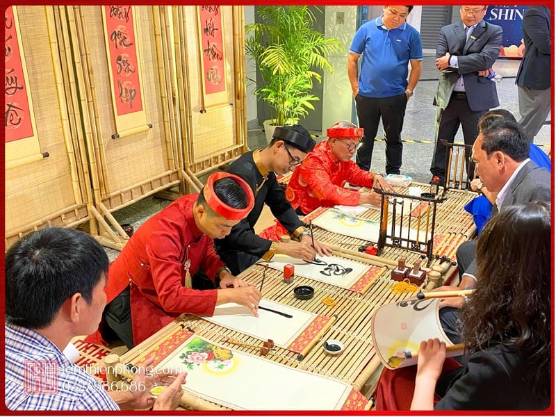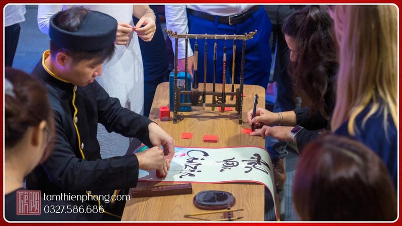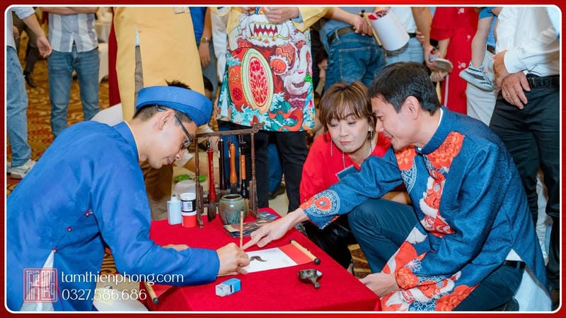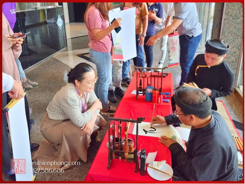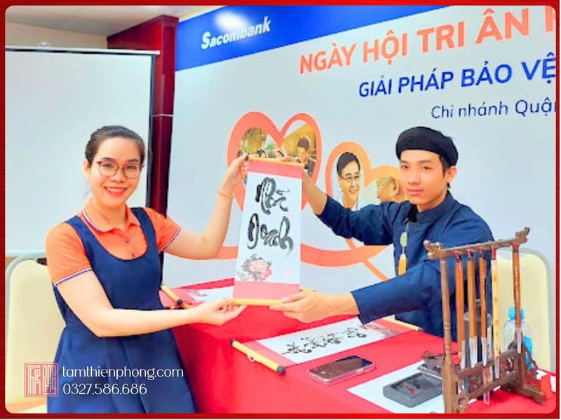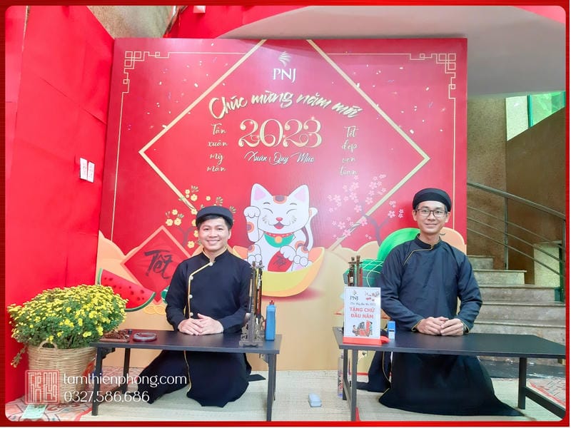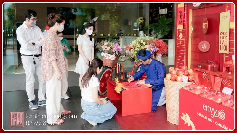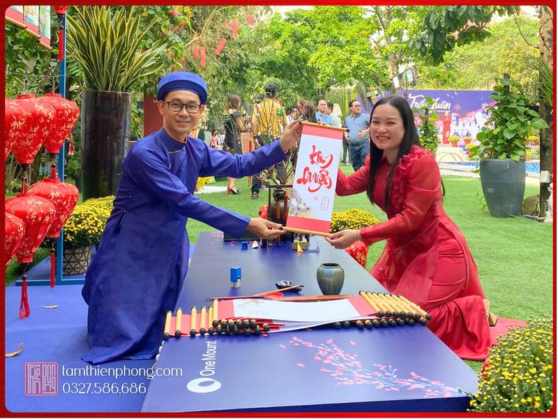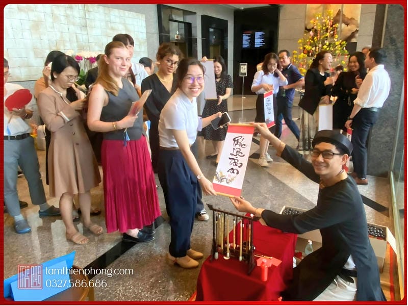 Công ty TNHH Tâm Thiên Phong chuyên cung cấp Dịch vụ Ông đồ tặng chữ thư pháp tại các sự kiện Year End Party (YEP), quảng bá thương hiệu, tri ân khách hàng, lễ khai trương, giao lưu văn hóa, tổ chức Workshop hướng dẫn trải nghiệm viết thư pháp, ... cho nhiều thương hiệu lớn với đội ngũ ông đồ chất lượng cao tại TpHCM và các tỉnh thành lân cận. Chúng tôi tự tin mang đến trải nghiệm hoàn hảo và ấn tượng tốt đẹp nhất cho khách hàng. Liên hệ ngay để được tư vấn. Trân trọng!