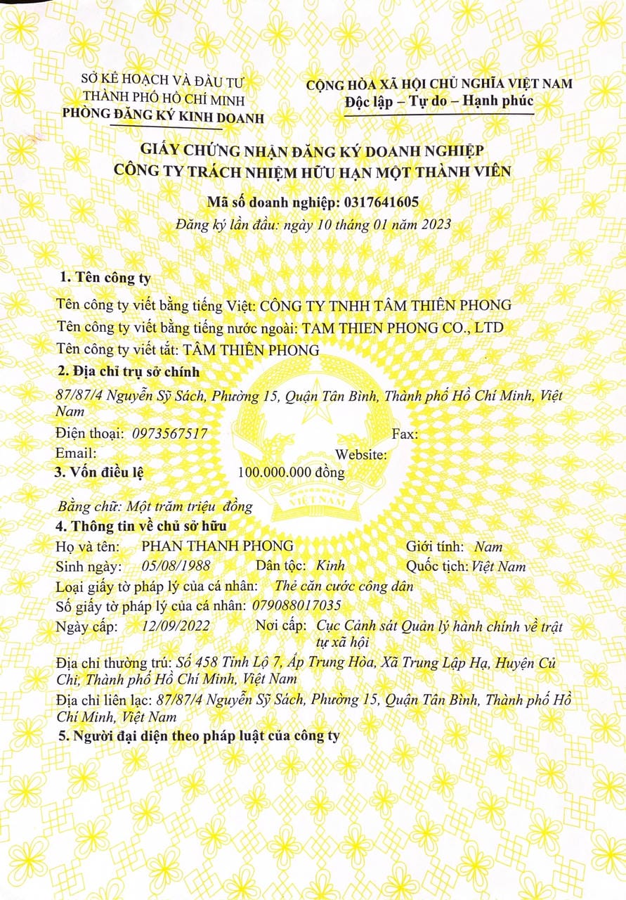 Giấy Phép Kinh Doanh Công Ty TNHH TÂM THIÊN PHONG