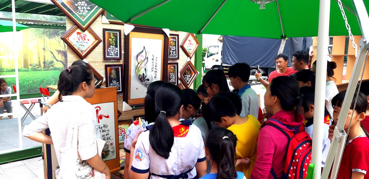 Học sinh xin chữ thư pháp ở TpHCM trong Ngày hội Văn hóa đọc